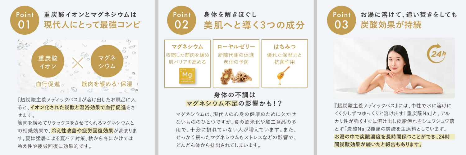 「超炭酸主義メディックバス」のタブレットがイオン化しながらゆっくりとお湯に溶けていきます。イオン化してお湯に溶け込んだ状態なので、追い焚きをしても効果は持続します。38℃~40℃くらいの少し温めのお湯に10分~20分入ることで、血行促進をしながら体をしっかりと温める炭酸や、緊張やストレスを緩和するマグネシウムがしっかりと働きます。さらにお湯に溶け込んだ保湿成分が体全体を包み込むため、冬の寒さで乾燥した身体全体をしっかりと保湿します。