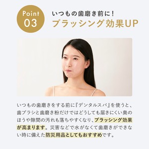 歯磨きをする前に「デンタルスパ」を使うと、歯磨きでは届きにくい汚れも落ちやすくなり、ブラッシング効果が高まります。また、歯磨きができない時でも、水がなくてもササっとオーラルケアが手軽にできます。