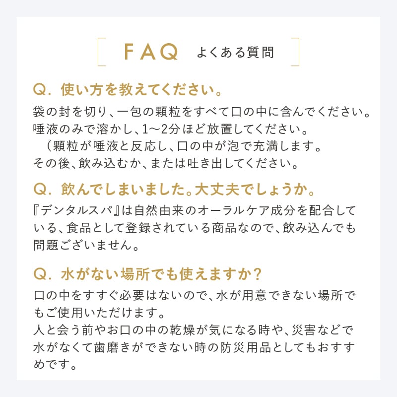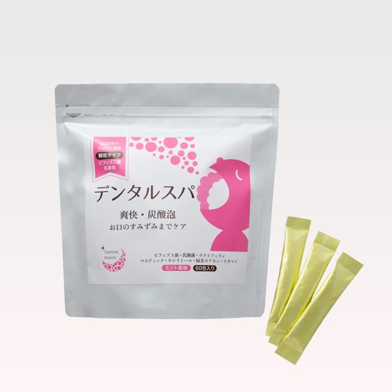 顆粒(粉末)タイプの「デンタルスパ」は、口に含むと炭酸顆粒が唾液と反応して、炭酸泡がお口の中いっぱいに広がります。口の中の唾液や水分と反応する炭酸顆粒なので、口に含んで1分放置するだけでOK。水がなくても手軽にオーラルケアができる商品です。食品として登録されている商品なので、このまま飲み込んでも問題ございません。