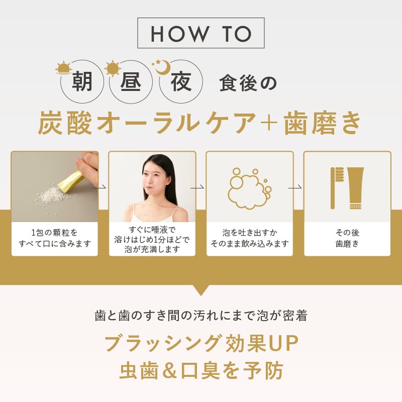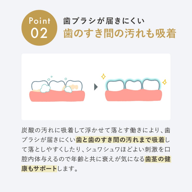炭酸本来の力をオーラルケアに活かすことを考えて、開発された商品で、炭酸の汚れに吸着して浮かせて落とす働きにより、歯ブラシが届きにくい歯と歯のすき間の汚れに吸着して落としたり、年齢と共に気になる歯茎の健康もサポートします。