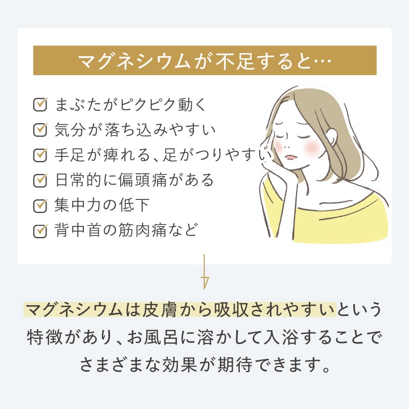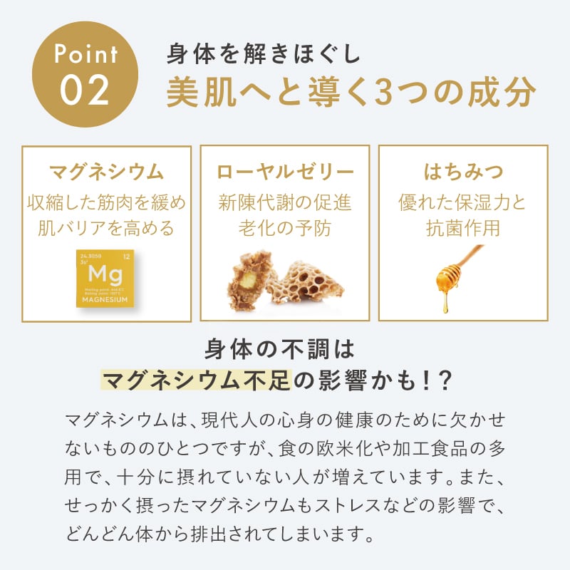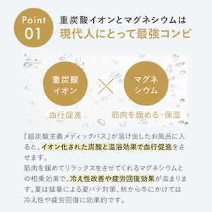 イオン化された炭酸と温浴効果で血行促進をさせ、筋肉を緩めてリラックスをさせてくれるマグネシウムとの相乗効果で、冷え性改善や疲労回復効果が高まります。肌表面の汚れや古い角質をやさしく取り除き、ローヤルゼリーやハチミツなどの配合で保湿効果も高い入浴剤です。