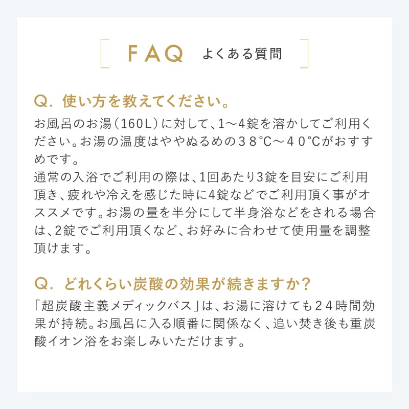 超炭酸主義メディックバスは1錠16gで、お風呂のお湯(160L)に対して、1~4錠を溶かしてご利用ください。通常の入浴でご利用の際は、1回あたり3錠を目安にご利用頂き、疲れや冷えを感じた時に4錠などでご利用頂く事がオススメです。お湯の量を半分にして半身浴などをされる場合は、2錠でご利用頂くなど、お好みに合わせて使用量を調整頂けます。