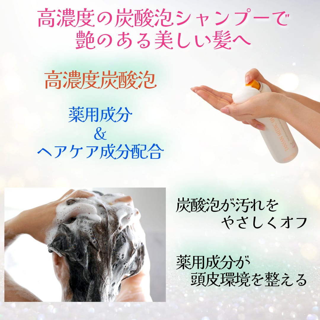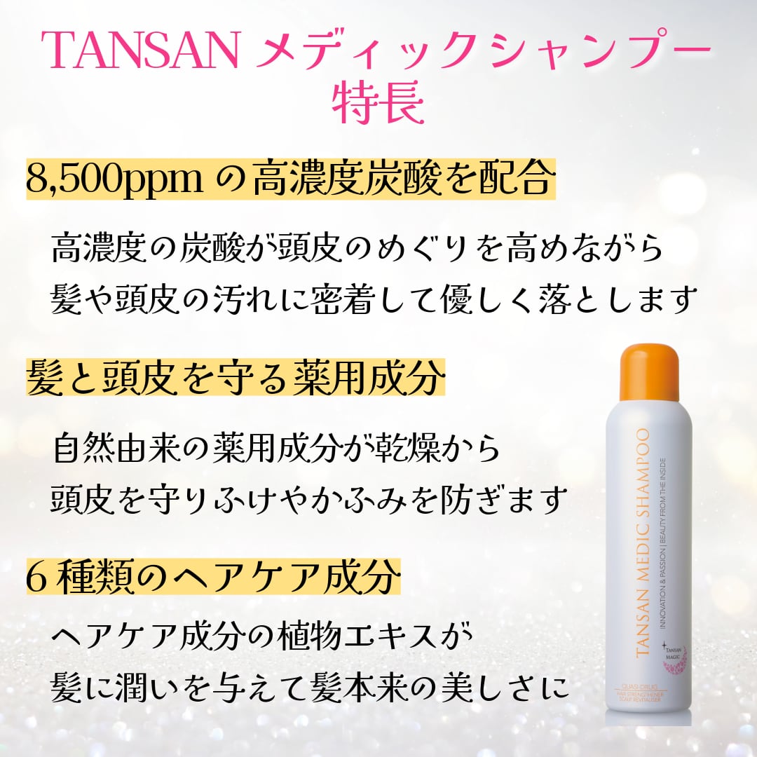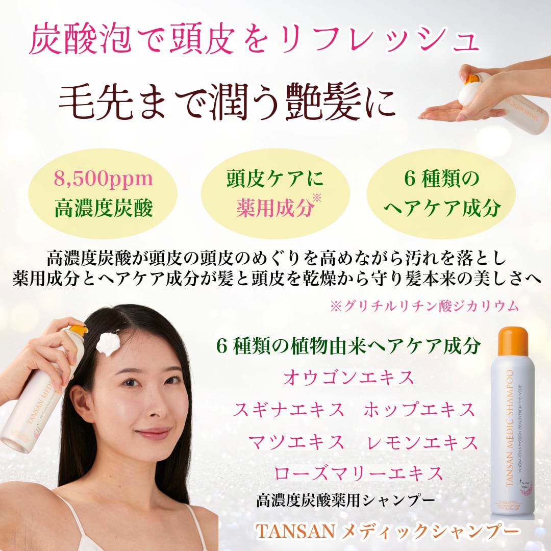 「TANSANメディックシャンプー」は高濃度の炭酸を配合した薬用シャンプーです。炭酸泡には8,500ppmの炭酸と自然由来の薬用成分とヘアケア成分が配合されています。